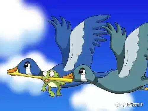 青蛙蹦蹦跳跳,不一会儿就找了根小棍子来,大雁哥哥咬住这一头,大雁嫂嫂咬着那一头,青蛙咬着小棍子中间。一切准备就绪,两只大雁一齐飞起来,就把青蛙带着跑了。